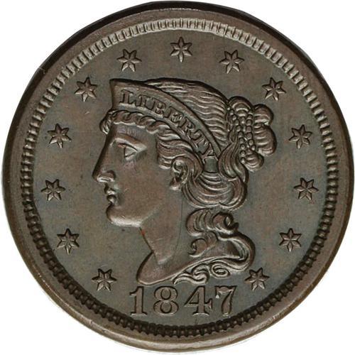 <B>1847<1C> N-24, R.1--Improperly Cleaned--NCS. Unc Details. AU50 EAC.</B></I> Grellman state c. This intermediate die state, with a fine crack through the tops of ME, was originally described by Newcomb as his variety number 9. This example is a bit finer than Brown: 427, in the same die state. Lustrous golden-brown surfaces beneath blue-green toning.<BR><I>Ex: Greenwood; Robert S. Carter; Del Bland (5/15/1970).</B></I> Envelope Included.
