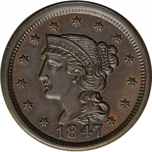 <B>1847<1C> N-8, R.3--Environmental Damage--NCS. Unc Details. MS60 EAC.</B></I> Grellman state d. Lustrous dark chocolate brown with deeply faded mint color on both sides. The environmental damage is not at all obvious; in fact, we do not see any such damage on this lovely example. The reverse has rim breaks over S O and also over AM. Only seven examples are known in this die state, according to Grellman in the Brown catalog.<BR><I>Ex: Del Bland (3/31/1970).</B></I> Envelope Included.