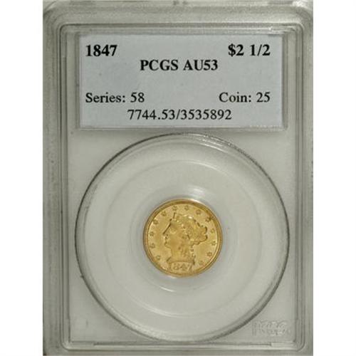 <B>1847 $2 1/2 AU53 PCGS.</B></I> A lovely example with hints of pale green color on honey-gold surfaces. This piece is sharply detailed and exhibits satiny luster. This date is scarce in all grades.<BR><BR><b>Shipping:</b> Coins & Currency (<a target="_blank" href="http://www.heritageauctions.com/common/shipping.php">view shipping information</a>)