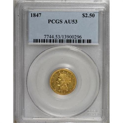 <B>1847 $2 1/2 AU53 PCGS.</B></I> One of just 29,800 pieces struck for this earlier Liberty Philadelphia issue, coined two years before news of California's gold became widespread. Well struck with significant remaining luster on the lemon-gold surfaces. Population: 3 in 53, 16 finer (8/07).<BR><BR><B>Coin Engraver:</B> Christian Gobrecht<BR><BR><b>Shipping:</b> Coins & Currency (<a target="_blank" href="http://www.heritageauctions.com/common/shipping.php">view shipping information</a>)