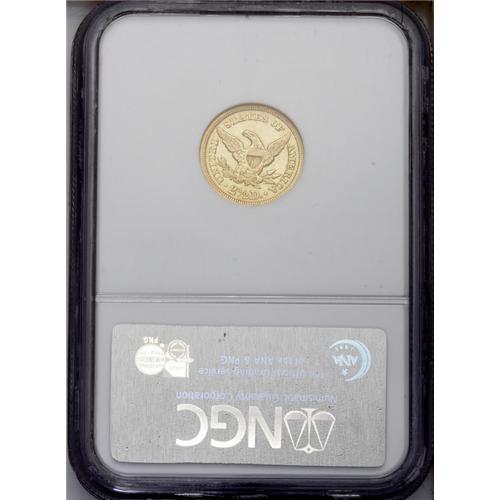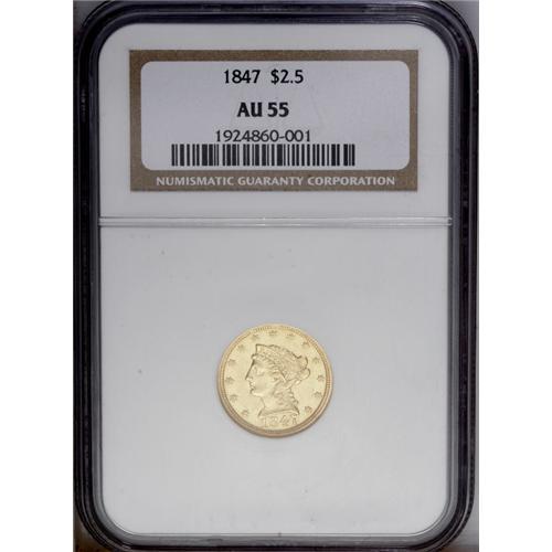 <B>1847 $2 1/2 AU55 NGC.</B></I> This is a scarcer date from a limited mintage of just 29,800 coins. Today, few survivors reach the AU grade level, with Choice AU examples being quite difficult to locate. Although die variety of the Liberty Head gold coinage have only been lightly studied, this example is intriguing for the date is quite large and fills nearly the entire space allotted. Lustrous light yellow surfaces with typical minor abrasions.