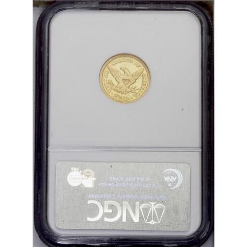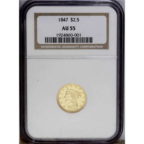 <B>1847<$2 1/2> AU55 NGC.</B></I> This is a scarcer date, from a limited mintage of just 29,800 coins. Today, few survivors reach the AU grade level, with Choice AU examples being difficult to locate. Although die varieties of the Liberty Head gold coinage have only been lightly studied, this example is intriguing, for the date is quite large and fills nearly the entire space allotted. Lustrous light yellow surfaces with typical minor abrasions. <BR><BR><B>Important notice:</B> Heritage usually auctions material at the rate of 200-250 lots per hour. On some occasions eBay Live bid software or the Internet may not be able to keep up with the pace of the auction. We recommend placing a realistic absentee bid now as insurance to avoid disappointment. Occasionally the auctioneer may eliminate or reject an eBay Live bid, and the auctioneer may also reopen a lot after the close of the eBay live bidding (usually because we missed an audience bid), and may reject your bid even if it shows you as the winning bidder. By bidding via eBay Live, you agree that Heritage may award the lot to another bidder at its sole discretion under the circumstances described above or any other reasonable circumstances. Since eBay bids are not shown to us until we open the lot on the floor, we treat those bids just like floor bids. In most cases the floor responds before the eBay bid is presented to us, due to Internet lag time, so for consistency we have made it a policy that floor bids are always considered first over tie eBay live bids. Also please note that all Heritage lots purchased through eBay Live carry a 20% Buyer's Premium. Please make sure you read the Terms and Conditions before you bid. This lot is being auctioned in conjunction with a live floor auction by Heritage Galleries & Auctioneers. All final auction and invoice information will be supplied by Heritage Galleries & Auctioneers, and all other information should be considered preliminary. Lot:2372 <BR><BR><B>Winning Notification and Billing:</B> After the FINAL session in this auction is complete, Heritage will send e-mail and snail mail invoices. This process normally takes several days. All final auction and invoice information will be supplied by Heritage Galleries & Auctioneers, and all other information should be considered preliminary. <BR><BR>This auction will be conducted on a live auction floor and over the Internet through eBay Live. If you choose to place an absentee bid, please take a moment to <font color='#0000ff'><u><a href='http://pages.ebay.com/liveauctions/help/before/laabsentee.html'>learn how eBay Live absentee bidding works</a></u></font><font color='#000000'>
