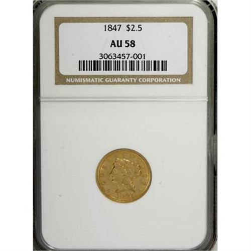 <B>1847 $2 1/2 AU58 NGC.</B></I> An attractive, luminous near-Mint representative from this pre-California Gold Rush issue, well struck with a trace of highpoint friction. A handful of abrasions in the field have little influence on the overall eye appeal. Census: 34 in 58, 20 finer (12/07).<BR><BR><B>Coin Engraver:</B> Christian Gobrecht<BR><BR><b>Shipping:</b> Coins & Currency (<a target="_blank" href="http://www.heritageauctions.com/common/shipping.php">view shipping information</a>)