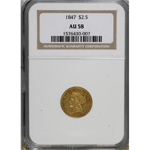 <B>1847 $2 1/2 AU58 NGC.</B></I> Whispers of subtle luster appear at the margins of this briefly circulated quarter eagle. An excellent survivor from the pre-California Gold Rush era. Census: 37 in 58, 20 finer (2/08).<BR><BR><B>Coin Engraver:</B> Christian Gobrecht<BR><BR><b>Shipping:</b> Coins & Currency (<a target="_blank" href="http://www.heritageauctions.com/common/shipping.php">view shipping information</a>)