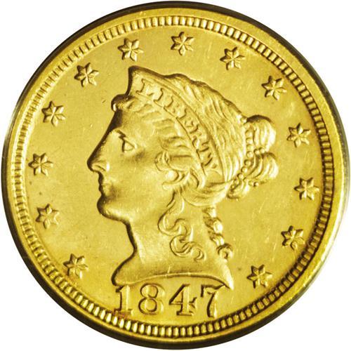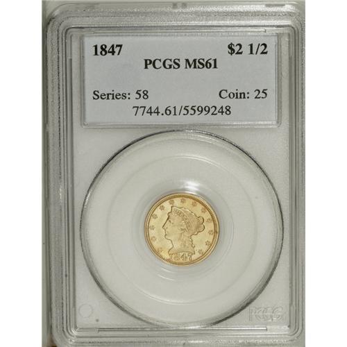 1847 $2 1/2 MS61 PCGS. Pale yellow, with hints of lime