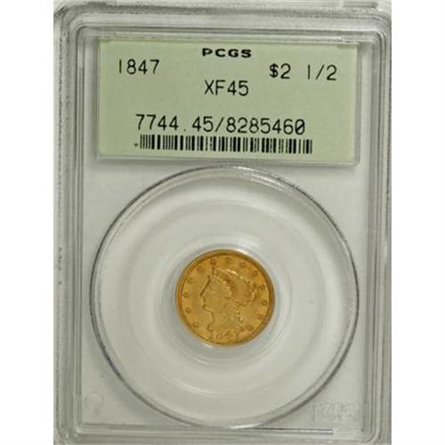 <B>1847 $2 1/2 XF45 PCGS.</B></I> This is a remarkably attractive and well detailed example for the grade. Boldly struck except for slight weakness on some of the highpoints. Appealing lime-green and gold toning appears over the faintly marked surfaces, that seem minimally worn. The low mintage and poor rate of survival makes this a scarce quarter eagle issue, at all levels of preservation. <BR><BR><B>Coin Engraver:</B> Christian Gobrecht<BR><BR><b>Shipping:</b> Coins & Currency (<a target="_blank" href="http://www.heritageauctions.com/common/shipping.php">view shipping information</a>)