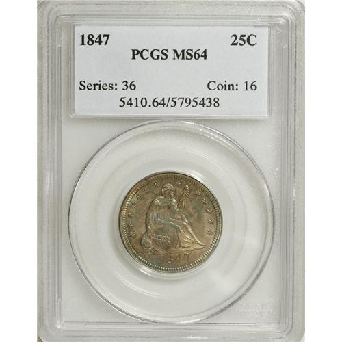 <B>1847 25C MS64 PCGS.</B></I> Lustrous and well struck with a variegated mix of turquoise-green and amber coloration over both sides. Surface blemishes are nonexistent. Population: 8 in 64, 1 finer (3/07).<BR><BR><b>Shipping:</b> Coins & Currency (<a target="_blank" href="http://www.heritageauctions.com/common/shipping.php">view shipping information</a>)