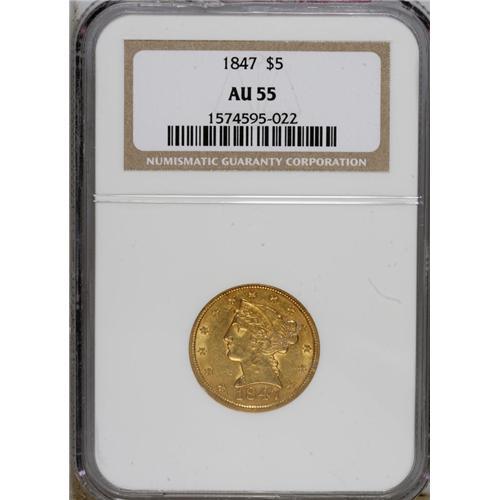 1847 $5 AU55 NGC. NGC Census: (180/638). PCGS Popu