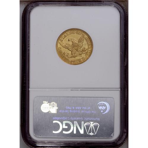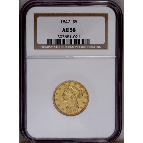 <B>1847 $5 AU58 NGC.</B></I> A nice lightly circulated example of this early Liberty five. Substantial luster is still present, and there is only a trace of friction on the highpoints that prevents a higher grade.