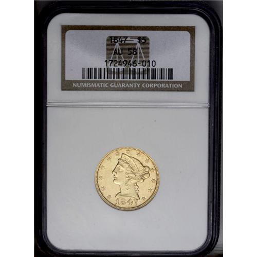 <B>1847<$5> AU58 NGC.</B></I> This pleasantly smooth No Motto five is boldly struck for its type. Luster individually outlines the stars, and connects the reverse legends. High mintages of gold coins in 1847 are sometimes attributed to the need to pay soldiers for the war with Mexico.