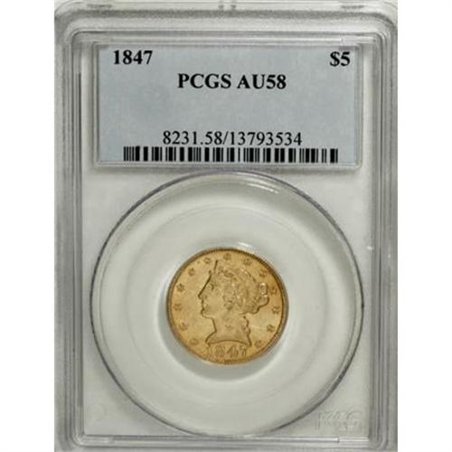 <B>1847 $5 AU58 PCGS.</B></I> Although it is one of the most common No Motto half eagles due to its large mintage of nearly 1 million pieces, survivors in Mint State is nonetheless scarce. Much luster remains on the amber-gold surfaces, which show few distractions save for minor strike weakness on the eagle.<BR><BR><B>Coin Engraver:</B> Christian Gobrecht<BR><BR><b>Shipping:</b> Coins & Currency (<a target="_blank" href="http://www.heritageauctions.com/common/shipping.php">view shipping information</a>)