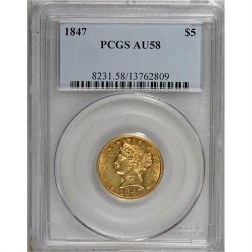 <B>1847 $5 AU58 PCGS.</B></I> . PCGS Population (48/112). NGC Census: (192/153). Mintage: 915,981. Numismedia Wsl. Price for NGC/PCGS coin in AU58: $540. (#8231)<BR><BR><B>Coin Engraver:</B> Christian Gobrecht<BR><BR><b>Shipping:</b> Coins & Currency (<a target="_blank" href="http://www.heritageauctions.com/common/shipping.php">view shipping information</a>)