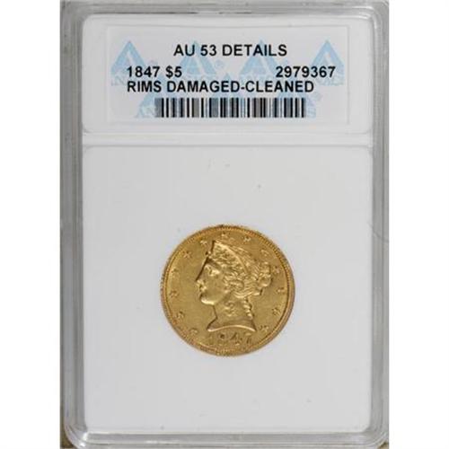 <B>1847 $5 --Cleaned, Rim Damaged--ANACS. AU53 Details.</B></I> NGC Census: (37/412). PCGS Population (34/219). Mintage: 915,981. Numismedia Wsl. Price for NGC/PCGS coin in AU53: $352. (#8231)<BR><BR><b>Shipping:</b> Coins & Currency (<a target="_blank" href="http://www.heritageauctions.com/common/shipping.php">view shipping information</a>)