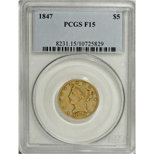 <B>1847 $5 F15 PCGS.</B></I> PCGS Population (3/412). NGC Census: (0/587). Mintage: 915,981. Numismedia Wsl. Price for NGC/PCGS coin in F15: $180. (#8231)<BR><BR><B>Coin Engraver:</B> Christian Gobrecht<BR><BR><b>Shipping:</b> Coins & Currency (<a target="_blank" href="http://www.heritageauctions.com/common/shipping.php">view shipping information</a>)