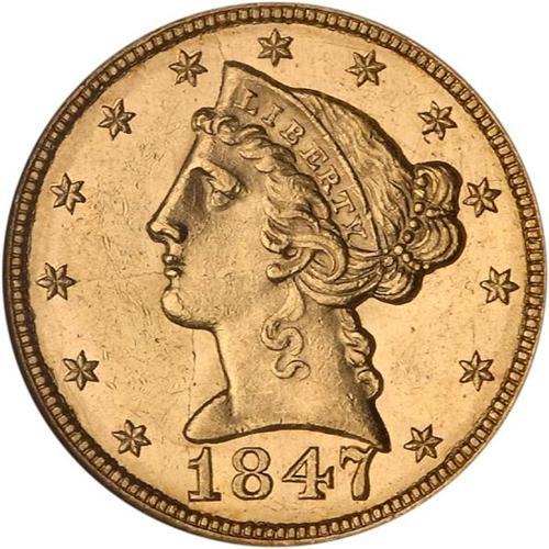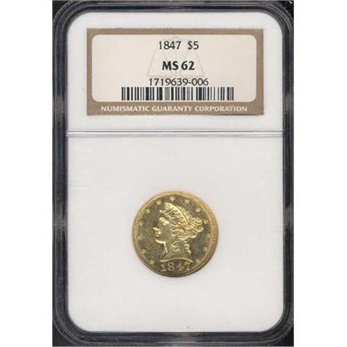 <b>1847 $5 Liberty. NGC graded MS62.</b> NGC Pop: 54/33. Pleasant, almost cheery bright gold satin to semi-prooflike luster displays lots of fresh gold color. And while there are the usual small nicks and scuffs, the surface is definitely brilliant on this important No Motto Type coin. Both sides are sharp, including crisp neck, wing, and leg feathers on the eagle <b>(PCGS # 8231)</b>