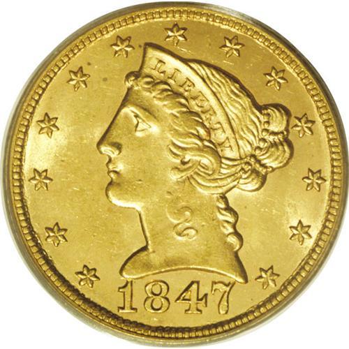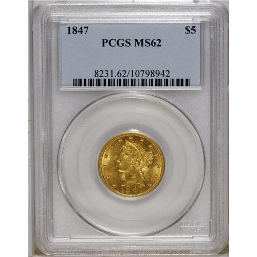 <B>1847 $5 MS62 PCGS.</B></I> With a mintage of nearly 1 million coins, the 1847 half eagle is the most common date of the 1840s. Circulated pieces can be found with relative ease, but Mint State coins are somewhat more difficult to locate. This MS62 example exhibits lustrous peach-gold surfaces and generally well struck motifs, though the centers reveal minor softness. A few inoffensive handling marks are noted over each side. Population: 39 in 62, 25 finer (12/06).<BR><BR><b>Shipping:</b> Coin/Currency (<a target="_blank" href="http://www.heritageauctions.com/common/shipping.php">view shipping information</a>)