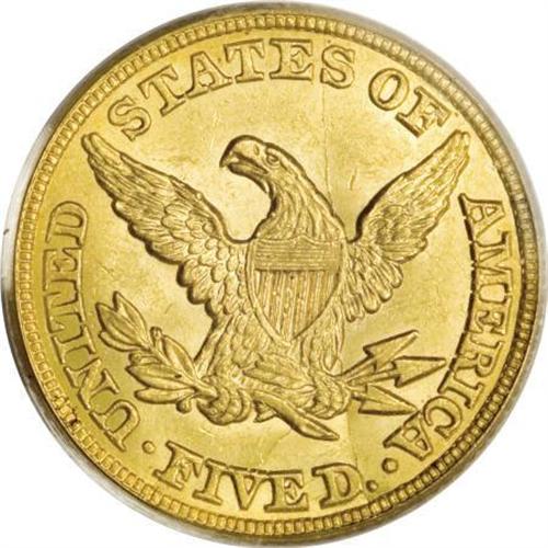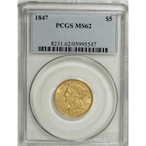 <B>1847 $5 MS62 PCGS.</B></I> An attractive Mint State representative of this earlier Liberty Head half eagle issue, crisply struck with satiny surfaces that show a flicker of greater vibrancy at the margins. The apricot-gold surfaces show a hint of peach and a few faint alloy spots near the rims. Lightly marked overall with a substantial vertical die crack across the reverse that passes between the shield and the eagle's right (facing) wing. Population: 45 in 62, 27 finer (8/07).<BR><BR><B>Coin Engraver:</B> Christian Gobrecht<BR><BR><b>Shipping:</b> Coins & Currency (<a target="_blank" href="http://www.heritageauctions.com/common/shipping.php">view shipping information</a>)