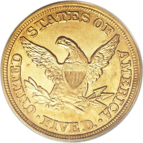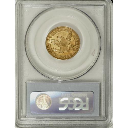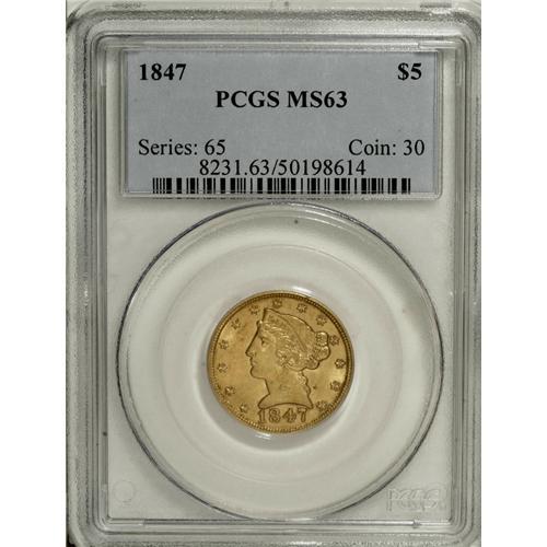 <B>1847 $5 MS63 PCGS.</B></I> Several letters of LIBERTY show minute doubling. This is a lovely example with frosty luster on the mustard-gold obverse and satiny luster on the reverse. The strike is sharp, including practically full central and peripheral details on both sides, though a trace of softness is noted at the hair around Liberty's ear and the eagle's neck feathers. An excellent candidate for the type collector who seeks an attractive Liberty, No Motto representative. Population: 23 in 63, 6 finer (2/07).<BR><BR><b>Shipping:</b> Coins & Currency (<a target="_blank" href="http://www.heritageauctions.com/common/shipping.php">view shipping information</a>)