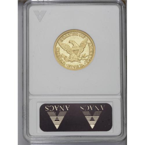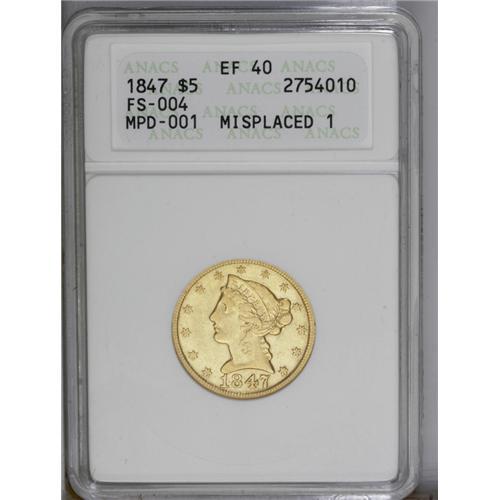 <B>1847 $5 XF40 ANACS.</B></I> FS-004, MPD-001. A misplaced 1 from the date punch emerges from the lower left edge of Liberty's neck. A similar error is found on certain Indian cent and three cent nickel varieties, but more of the 1 is present on the current <I>Cherrypickers'</B></I> variety. Typically struck, but substantial luster surrounds recessed areas.