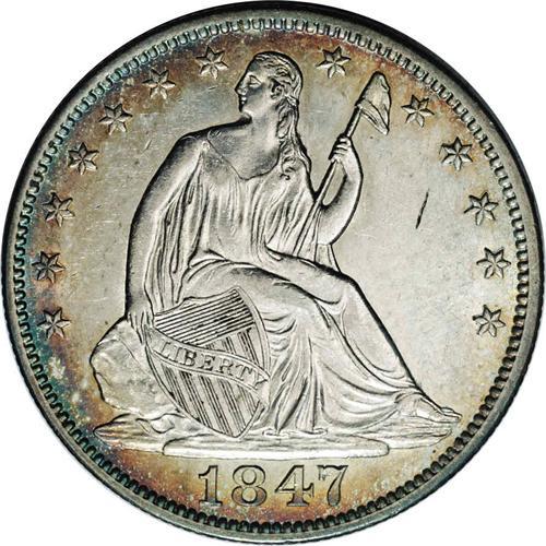 1847 50C AU58 NGC. Rich tan-gold, plum, and forest-gre 1847[50C] AU58 NGC.