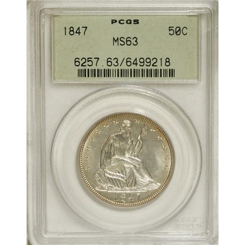 <B>1847 50C MS63 PCGS.</B></I> Lightly abraded overall with light yellow-gold patina at the margins. The strike is solid, and both sides of this pre-war piece exhibit pleasing luster. Encased in an old green label holder. Population: 10 in 63, 14 finer (3/07).<BR><BR><b>Shipping:</b> Coins & Currency (<a target="_blank" href="http://www.heritageauctions.com/common/shipping.php">view shipping information</a>)