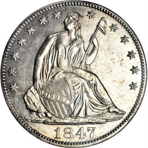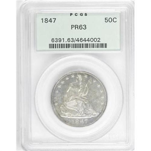 <B>1847 50C PR63 PCGS.</B></I> Randy Wiley and Bill Bugert, in <I>The Complete Guide to Liberty Seated Half Dollars</B></I>, write that less than 15 proofs of 1847 are known. An inspection of PCGS and NGC figures reveal 14 proofs, the finest rating PR66.<BR> The brilliant surfaces of this Select example display an even distribution of faint golden-tan speckles over the obverse, and an occasional blush of barely discernible tan on the reverse. A powerful strike imparts exquisite definition to the design features. Die polish lines in the fields of both sides should not be confused with hairlines. A thin diagonal mark is noted in the right obverse field. Housed in a green-label holder. Population: 2 in 63, 1 finer (12/07).<BR><BR><B>Coin Engraver:</B> Christian Gobrecht<BR><BR><b>Shipping:</b> Coins & Currency (<a target="_blank" href="http://www.heritageauctions.com/common/shipping.php">view shipping information</a>)