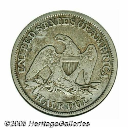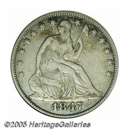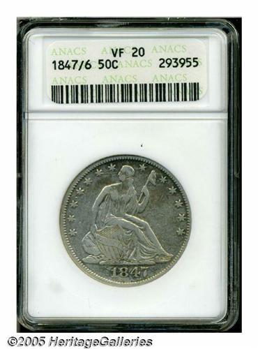 <B>1847/6<50C> VF20 ANACS.</B></I> FS-004, WB-102. The bottom curve of a 6 is obvious, located southwest of the 7 in the date. A desirable <I>Guide Book</B></I> variety that is coveted in all grades. The <I>Cherrypickers' Guide</B></I> states, "An extremely rare variety in any grade." This problem-free piece has light peripheral freckles of golden-brown and apple-green patina. LIBERTY is fully legible, and the eagle's wings have ample plumage detail.<BR><I>From The Empire State Collection.</B></I>