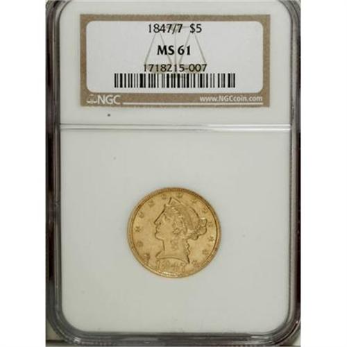 <B>1847/7 $5 MS61 NGC.</B></I> Breen-6570. 1847 appears to be a year of indifferent date punching at the Philadelphia Mint, since several die varieties of 1847 half eagles feature misplaced or repunched dates. <I>Cherrypickers'</B></I> lists four varieties for the date, but excludes the present variety, which shows clear recutting on the top of the 7. Well struck and original. The left obverse has a couple of slender, faint, but relatively lengthy marks.<BR><BR><B>Coin Engraver:</B> Christian Gobrecht<BR><BR><b>Shipping:</b> Coins & Currency (<a target="_blank" href="http://www.heritageauctions.com/common/shipping.php">view shipping information</a>)