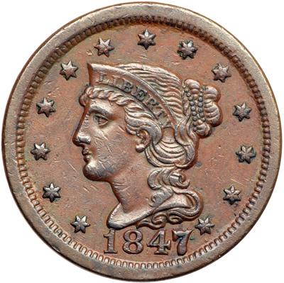 1847/7 N-2 R3. VF-30. Repunched Date, the so-called Large 7 over Small 7 variety. Slightly sharper with some nicks on the face, none notable but too many for the sharpness grade. Glossy medium brown with darker steel brown toning on the highpoints. Nicely struck E-MDS, die state a. Repunching is clearly visible on the 1, 4, and 7, and the "Large 7 over Small 7" feature is obvious.