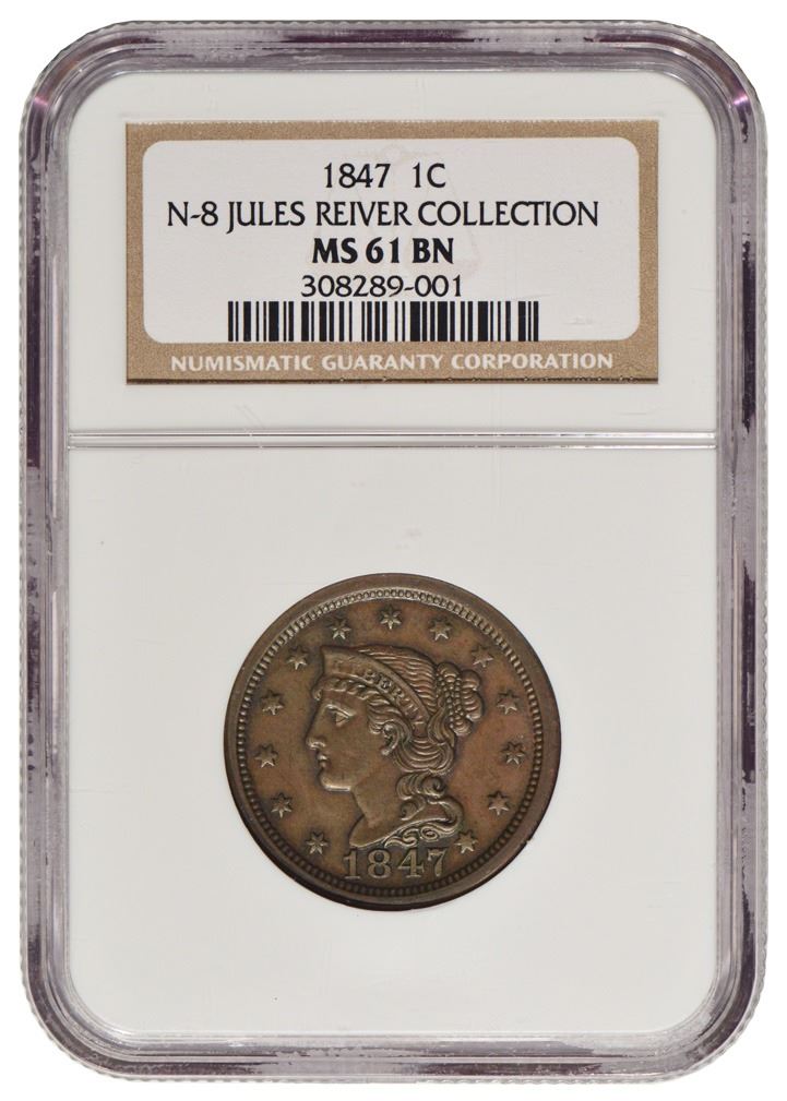 One 1847 Braided Hair Large Cent NGC MS61BN.