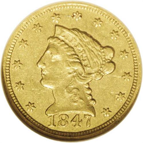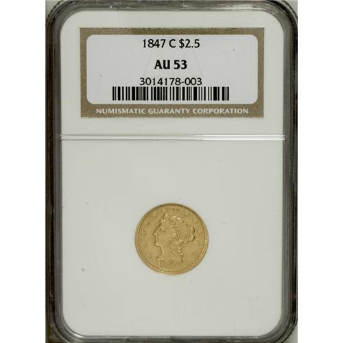 <B>1847-C $2 1/2 AU53 NGC.</B></I> Variety 8-F. Nicely struck for this widely collected Charlotte type coin, with only modest softness on the highpoints of the eagle's feathers. Both sides exhibit distinctive mustard-yellow color and retain much satiny luster in the protected areas.<BR><BR><b>Shipping:</b> Coin/Currency (<a target="_blank" href="http://www.heritageauctions.com/common/shipping.php">view shipping information</a>)