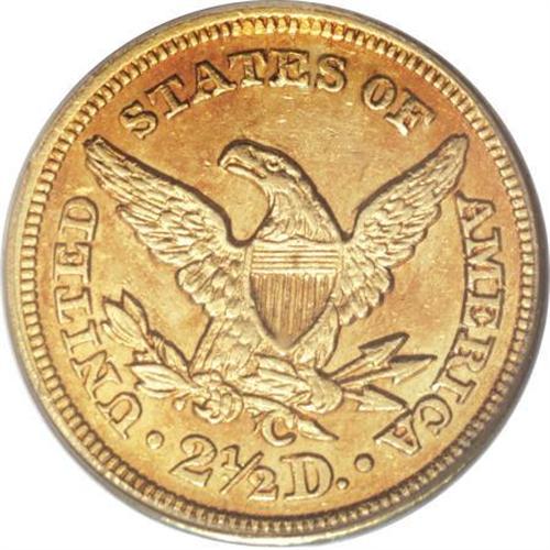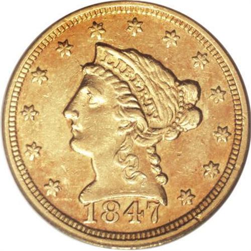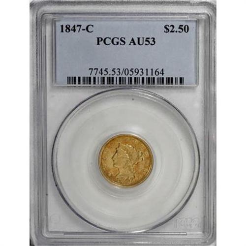 <B>1847-C $2 1/2 AU53 PCGS.</B></I> Variety 8-F. This exactingly struck Charlotte quarter eagle has lovely peach-gold toning, and any marks present are few and far between. Luster glimmers from protected areas. An impressive example of this popular Southern issue. A mere 23,226 pieces were struck.<BR><BR><B>Coin Engraver:</B> Christian Gobrecht<BR><BR><b>Shipping:</b> Coins & Currency (<a target="_blank" href="http://www.heritageauctions.com/common/shipping.php">view shipping information</a>\)