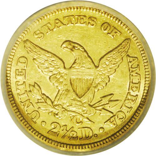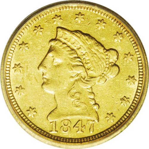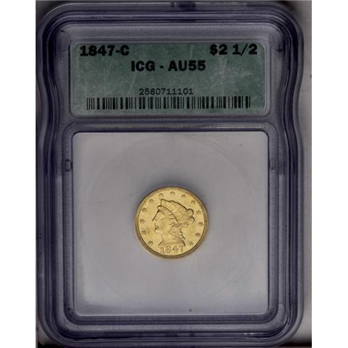 <B>1847-C<$2 1/2> AU55 ICG.</B></I> Variety 8-F. A suitably struck olive-gold C-mint gold type coin. Luster clings to the rims and device recesses. The left obverse has a few faint marks, but the appearance is smooth to the unaided eye. The 1847-C is available by the rarified standards of Charlotte quarter eagles, but since the mintage is only 23,226 pieces, it is very scarce by the broader measure of U.S. gold coins.