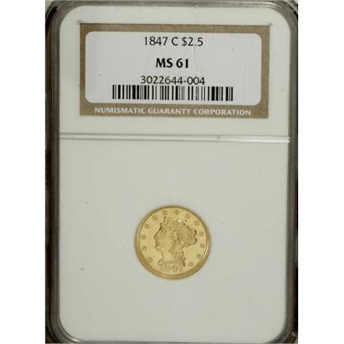 <B>1847-C $2 1/2 MS61 NGC.</B></I> Variety 8-F. Bright green-gold luster and reflective fields create excellent eye appeal on this Mint State piece. The surfaces are lightly abraded, consistent with the grade and not unusual for these Southern gold coins. The reverse of this example is rotated a few degrees counterclockwise. Census: 6 in 61, 20 finer (10/07).<BR><BR><B>Coin Engraver:</B> Christian Gobrecht<BR><BR><b>Shipping:</b> Coins & Currency (<a target="_blank" href="http://www.heritageauctions.com/common/shipping.php">view shipping information</a>)