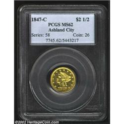 1847-C $2 1/2 MS62 PCGS. Winter 8-F. The 1847-C is the most available Charlotte Quarter Eagle by a substantial margin. Which means, of course, this is the issue most frequently used for type purposes. It also gives added significance to this particular coin as it is a solid Uncirculated piece, and even though outside the Condition Census, has a collectibility to a wide range of collectors. Sharply struck, especially on the obverse, the reverse shows the usual slight weakness on the eagle's plumage. The surfaces are bright overall with especially flashy fields, made so by die polishing seen on each side, which, of course, has imparted a strong prooflike sheen. The design features are satiny and there are numerous small field marks present, none of which are especially important but a small cluster around stars 12 and 13 might prove useful in the future should someone wish to trace this coin's pedigree.From the Ashland City Collection. Important notice: We expect to be auctioning lots at the rate of 200-250 per hour. Sometimes eBay Premier live bid software cannot keep up with that pace, so we strongly recommend that you place a realistic proxy bid now as insurance to avoid disappointment. Also please note that all Heritage/CAA lots purchased through eBay Premier carry a 20% Buyer's Premium. Please make sure you read the Terms and Conditions.