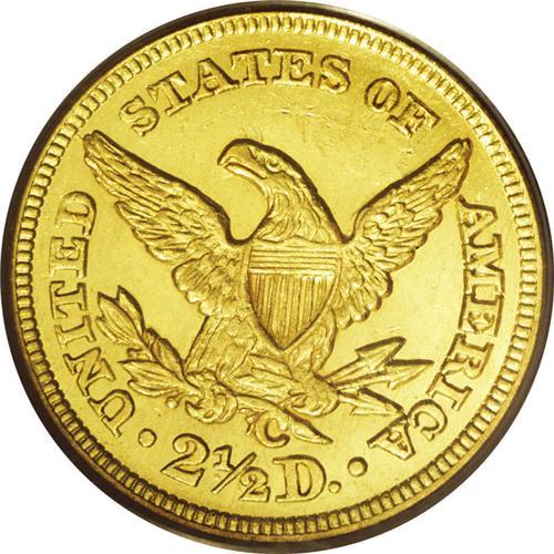 <B>1847-C<$2 1/2> MS63 PCGS.</B></I> Variety 8-F. 1847 was a year of peak activity at the Charlotte Mint, since North Carolina mines were still productive, and the war with Mexico increased demand for gold coinage. Nonetheless, most pieces struck by the facility were half eagles. The 1847-C quarter eagle has a relatively low mintage of 23,226 pieces, less than one-third of the emission of half eagles. Since no one collected gold coins by date and mintmark in 1847, these coins were regarded merely as bullion. Select Mint State survivors are rare. As of (8/06), PCGS reports six pieces in MS63 and another six in MS64, but these numbers are undoubtedly inflated to some extend by resubmissions over the past twenty years. This beautiful yellow-gold has pleasing luster, and the sharp strike belies its C-mint status. Best of all, there are no marks of any severity. A prize for the alert specialist.<BR><I>From The Della Collection.</B></I>