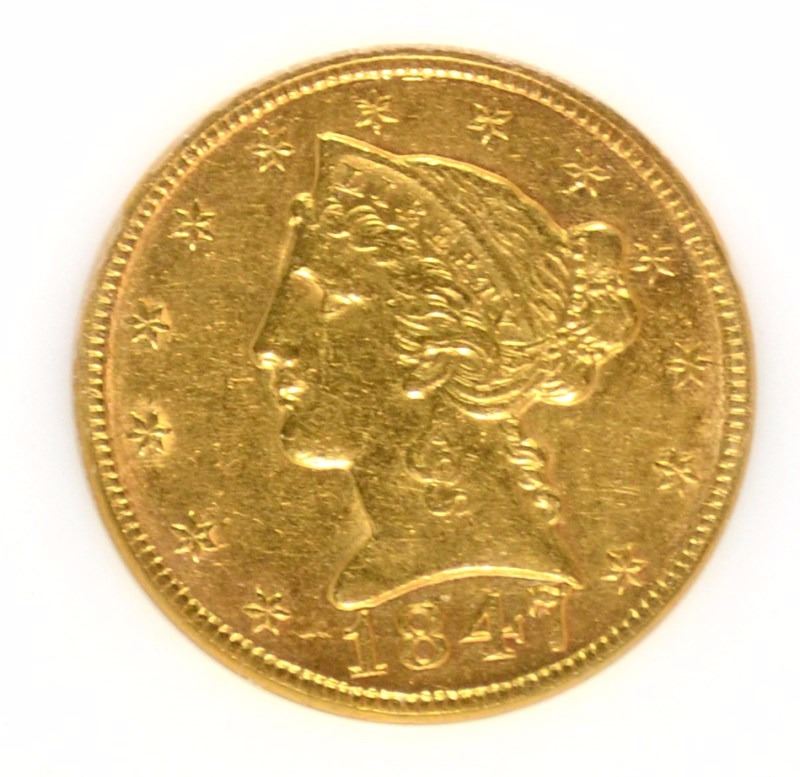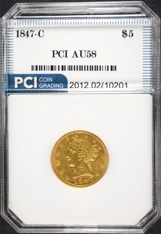 1847-C $5.00 GOLD, PCI AU/UNC LOW MINTAGE, HIGH DEMAND CHARLOTTE GOLD