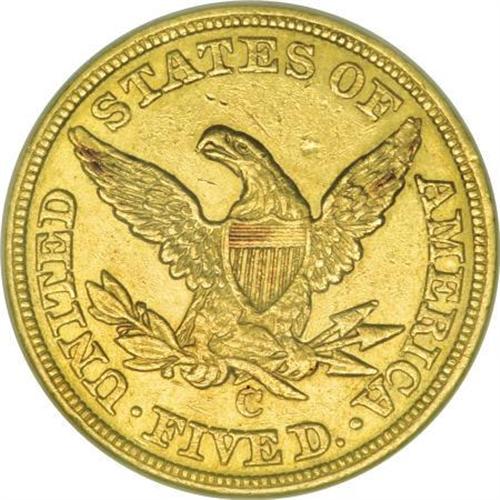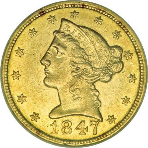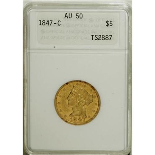 <B>1847-C $5 AU50 ANACS.</B></I> While not quite as sharply struck as the extremely bold PCGS AU58 example also in the Carolina Circle collection, this piece is still sharp for the date. It exhibits light green-gold color with a few coppery toning spots near the date and on the reverse at the shield and wings. The surfaces are quite lustrous with some semi-prooflike flashes seen. Light, scattered marks are seen that are consistent with an AU grade. This is a pleasing, uncleaned, and problem-free example that appears nicer than the assigned grade. The 1847-C is not an easy date to find in the middle to higher AU grades, especially with original color and choice surfaces as seen on this piece.<BR><I>From The Carolina Circle Collection.</B></I><BR><BR><B>Coin Engraver:</B> Christian Gobrecht<BR><BR><b>Shipping:</b> Coins & Currency (<a target="_blank" href="http://www.heritageauctions.com/common/shipping.php">view shipping information</a>)