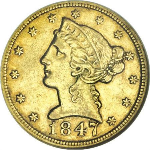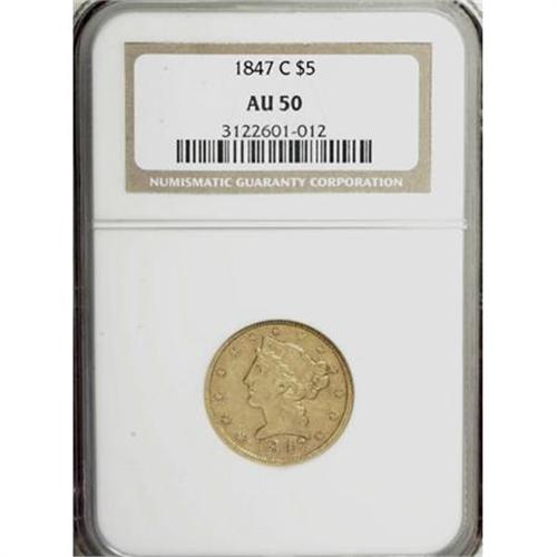 <B>1847-C $5 AU50 NGC.</B></I> Variety 9-E. An original caramel-gold Charlotte half eagle with smooth fields and impressive eye appeal. The strike is above average despite unimportant merging of detail on the hair bun, fletchings, and right (facing) claw.<BR><I>Ex: Greenwich Collection (Bowers and Merena, 1/91), lot 159.</B></I><BR><I>From The John Stimson, Sr. Collection, Part Two.</B></I><BR><BR><B>Coin Engraver:</B> Christian Gobrecht<BR><BR><b>Shipping:</b> Coins & Currency (<a target="_blank" href="http://www.heritageauctions.com/common/shipping.php">view shipping information</a>)