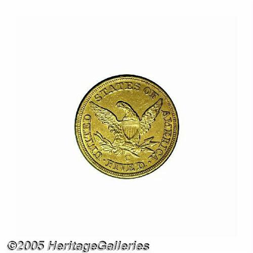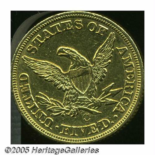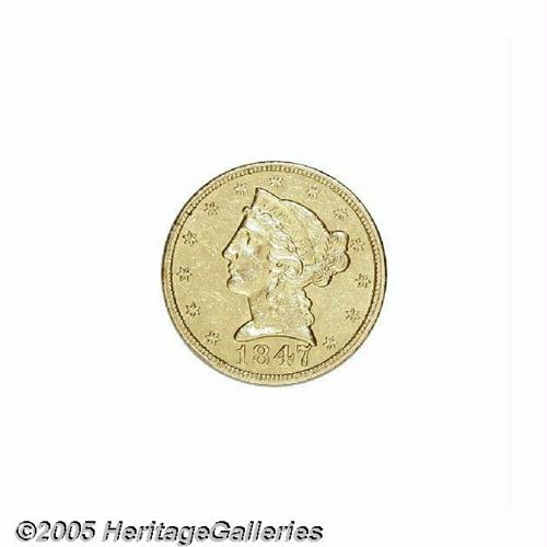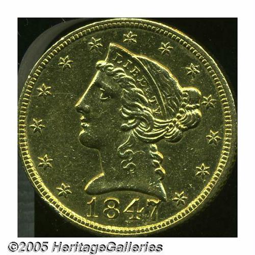 <B>1847-C<$5> AU58 Cleaned, Uncertified.</B></I> Variety 9-E. This high grade coin has been cleaned and we also note a rim bruise below the first star. A coin that probably did not circulate for more than a very brief time. The 7 touches the truncation of Liberty, as seen on most examples.