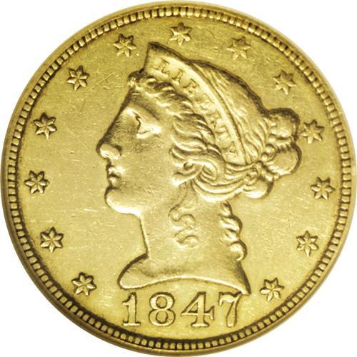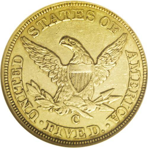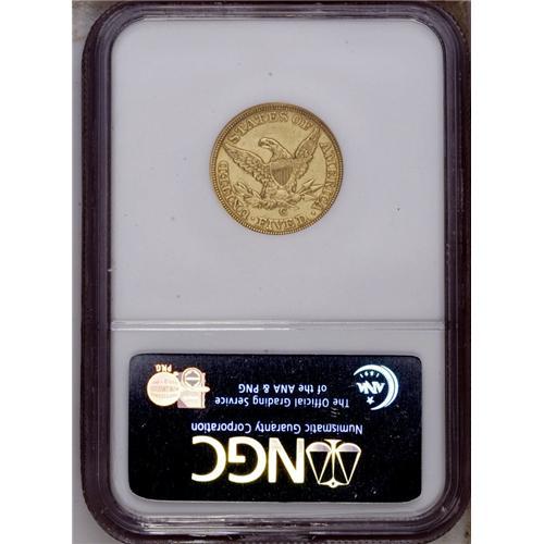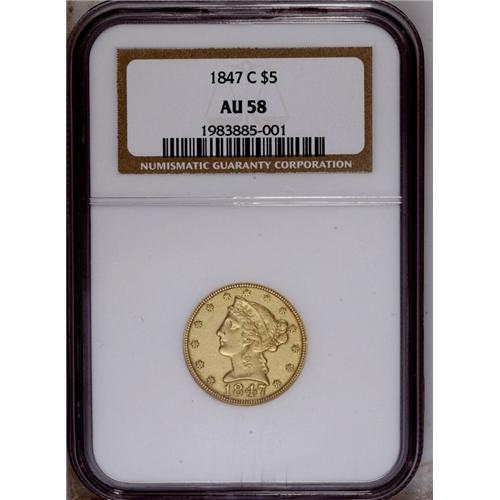 <B>1847-C $5 AU58 NGC.</B></I> Variety 9-E. As would be surmised from the relatively large mintage of 84,151 pieces, the 1847-C is one of the more readily obtainable issues among Charlotte half eagles and, as such, is an excellent choice for mintmark collectors. Although found without too much difficulty in XF and lower AU grades, pieces approaching or reaching Mint State are nevertheless legitimately scarce. Offered here is a bright green-gold representative with considerable luster and few surface marks than would normally be expected. The only abrasion worthy of mention is effectively buried in the eagle's shield. Census: 29 in 58, 14 finer (1/06).