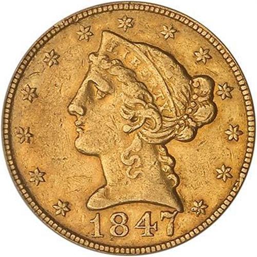 Near the peak of production at Charlotte, the 1847-C is widely available in various grades through Mint State and always attracts interest from collectors. Toned; normal surface abrasions from circulation.