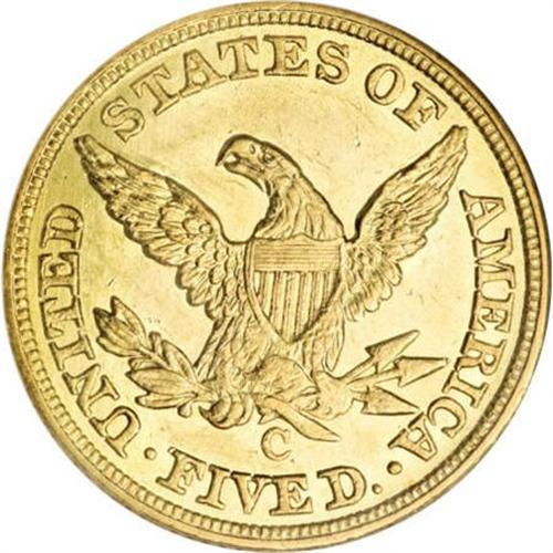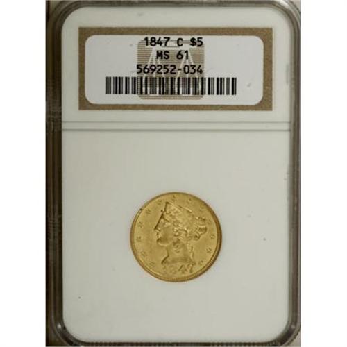 <B>1847-C $5 MS61 NGC.</B></I> Variety 9-E. In his <I>Gold Coins of the Charlotte Mint</B></I>, Doug Winter (1997) rated the 1847-C as the most available half eagle from that Mint overall. In better grades, while representatives are still available, he acknowledges that other issues can prove less challenging. Still, for the collector seeking to acquire a single Mint State example of Charlotte gold, the 1847-C five dollar piece remains a viable candidate.<BR> The MS61 representative offered here shows primarily yellow-gold and sun-gold shadings with elements of orange at Liberty's brow and earlobe. The obverse luster is mildly reflective, while the reverse exhibits subtle frostiness. Pleasingly detailed overall, though the hair below the coronet is a trifle soft. While a number of minor abrasions on each side preclude a finer designation, the coin retains significant eye appeal. Census: 7 in 61, 3 finer (11/07).<BR><BR><B>Coin Engraver:</B> Christian Gobrecht<BR><BR><b>Shipping:</b> Coins & Currency (<a target="_blank" href="http://www.heritageauctions.com/common/shipping.php">view shipping information</a>)