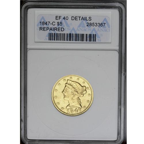 <B>1847-C<$5>--Repaired--ANACS. XF40 Details.</B></I> Variety 9-E. This bright and harshly cleaned piece has small repairs near Liberty's chin, beneath the TA in STATES, and beneath the eagle's right (facing) wing. The curls show some striking softness, but the overall sharpness is bold for the XF40 level.