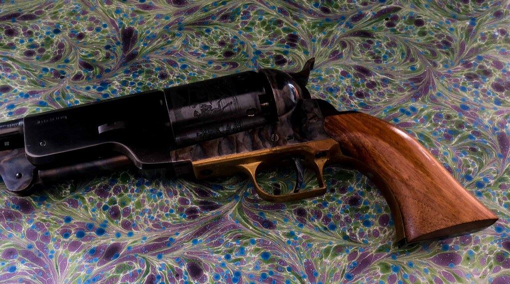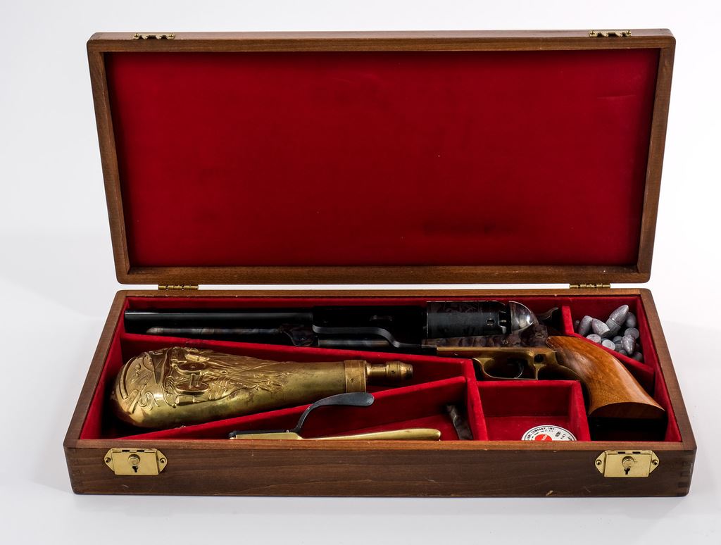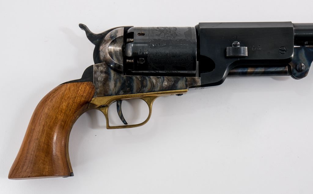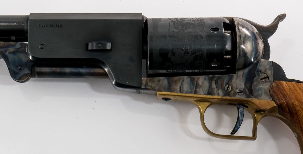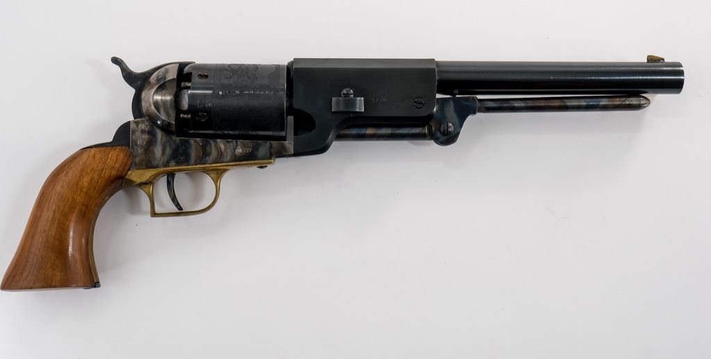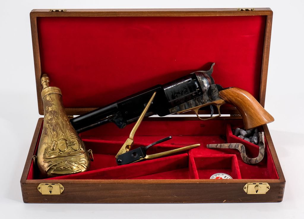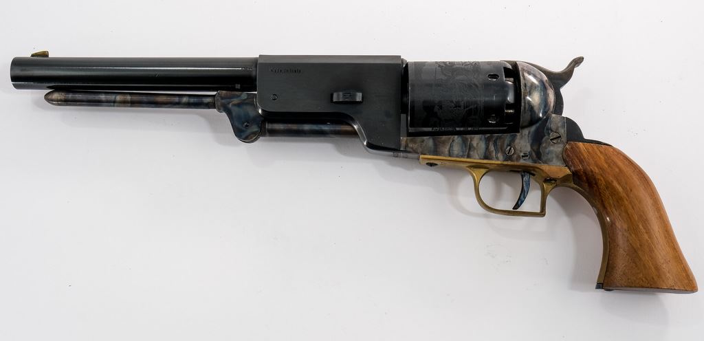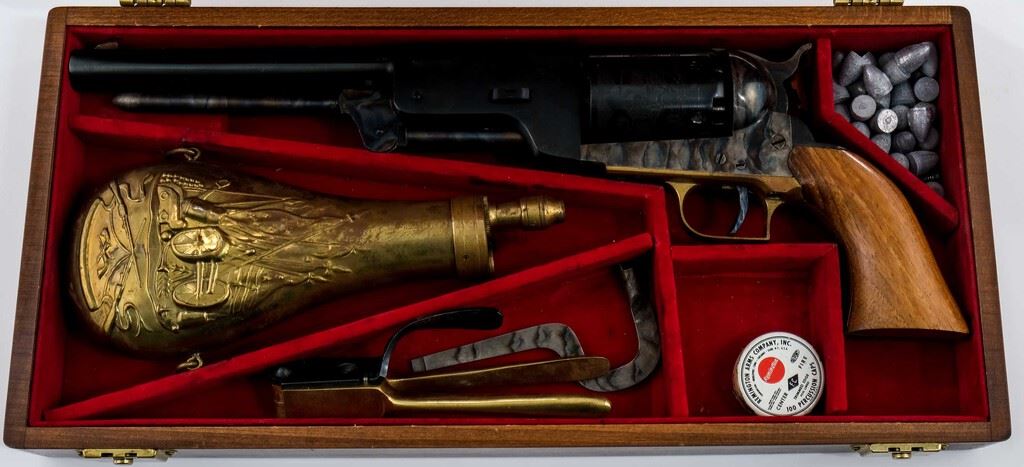 1847 Colt Walker by Armi San Marco of Italy. Chambered in .44 this is an exact and very well made replica of the famed 1847 Walker. This nicely blued and case colored pistol with brass trigger guard, hardwood grips and engraved cylinder comes cased with brass powder flask, bullet mold, takedown and nipple tool, cast bullets and tin of percussion caps. Condition: Overall in excellent mechanical and cosmetic condition with just a slight drag mark on the cylinder. No retrictions.