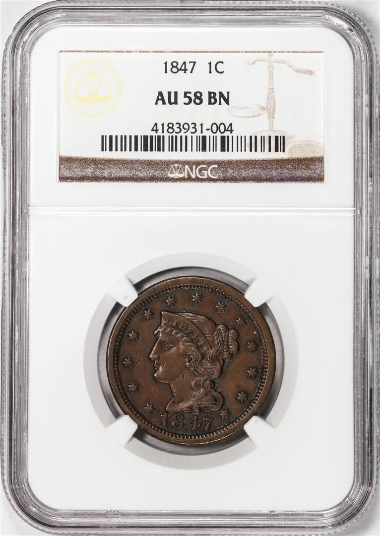 One 1847 Coronet Head Large Cent Coin NGC AU58BN. NGC Certified.