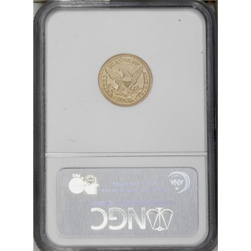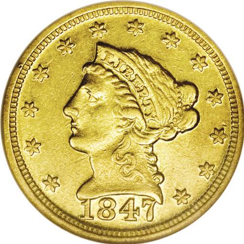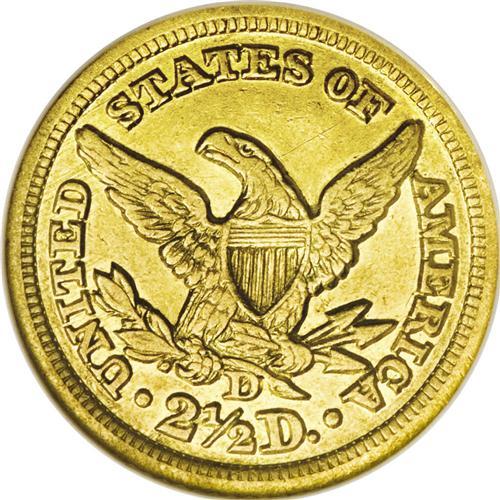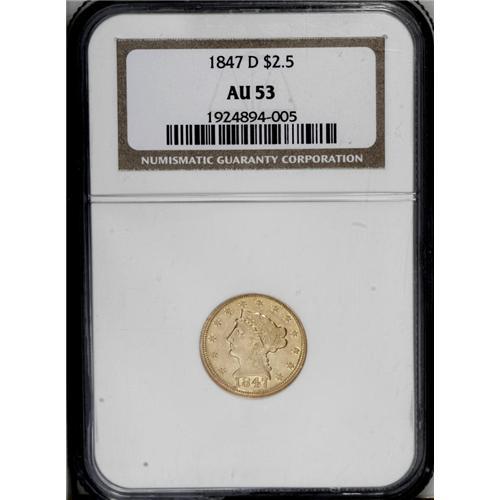 <B>1847-D<$2 1/2> AU53 NGC.</B></I> Variety 9-M. Attractive lemon-gold color, with plenty of reflectivity and luster remaining from what must have at one time been prooflike surfaces. The strike, although not full, is better than average in comparison to many Dahlonega gold issues, with a fair amount of detail showing on the eagle's left (facing) leg. A small amount of wear is visible on the raised points of the coin. An excellent type coin candidate.