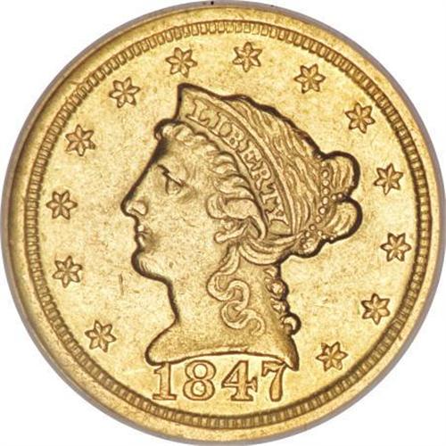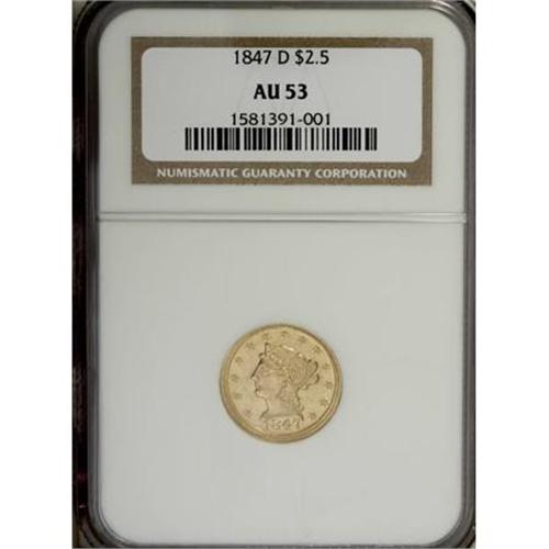 <B>1847-D $2 1/2 AU53 NGC.</B></I> Variety 9-M. A sharply defined light yellow-gold example with excellent luster on each side. The surfaces have light abrasions as so often seen on these Southern gold coins. This is not because they were treated more poorly than other coins, but rather because pieces were saved in lower quality and for longer periods of time.<BR><BR><B>Coin Engraver:</B> Christian Gobrecht<BR><BR><b>Shipping:</b> Coins & Currency (<a target="_blank" href="http://www.heritageauctions.com/common/shipping.php">view shipping information</a>)