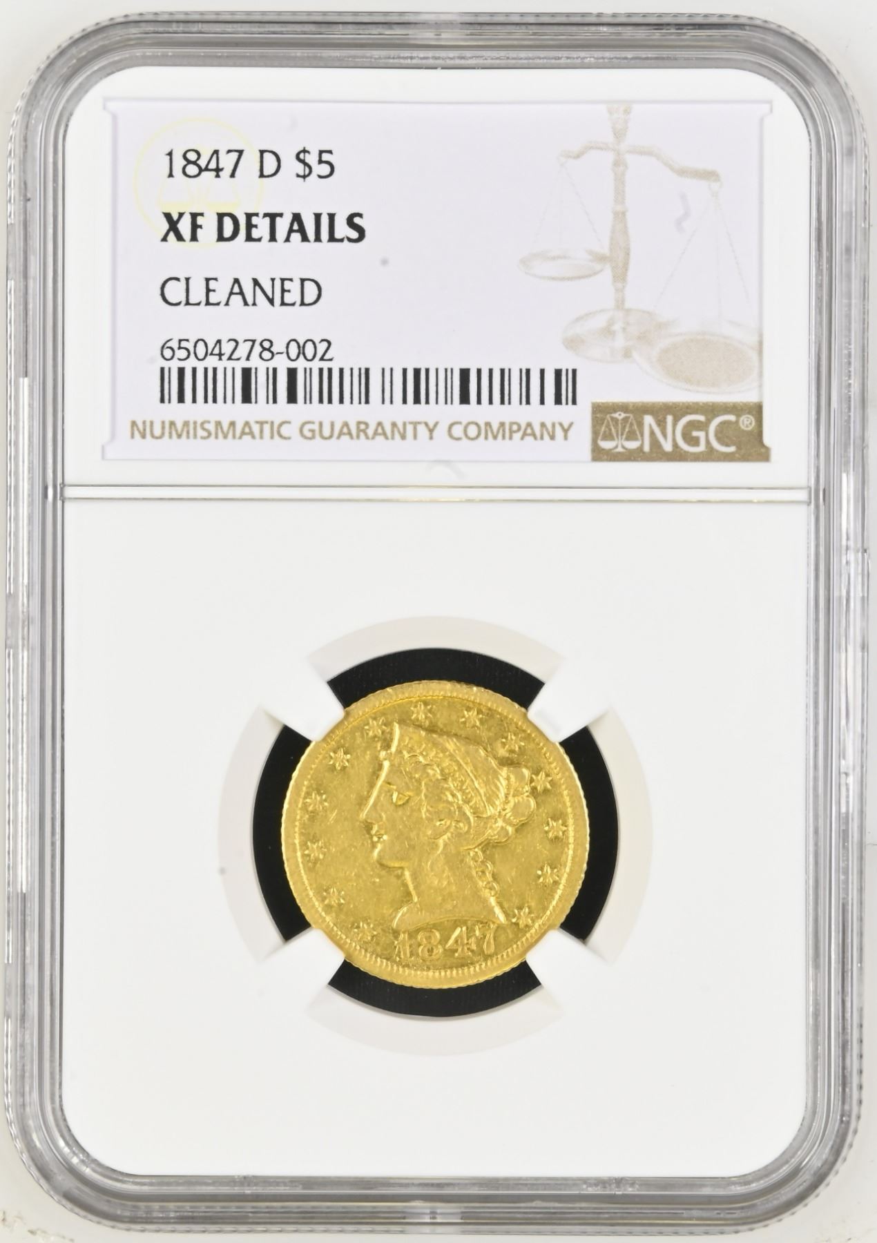 One 1847-D $5 Liberty Head Half Eagle NGC XF Cleaned.