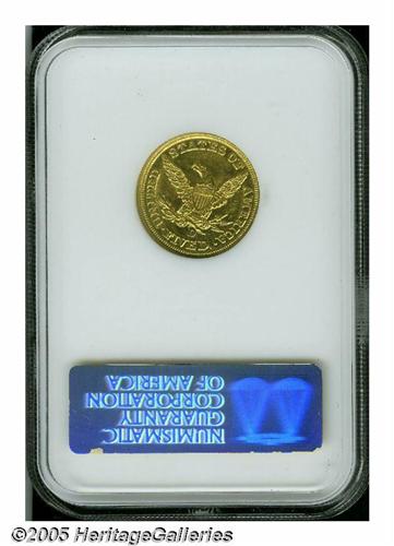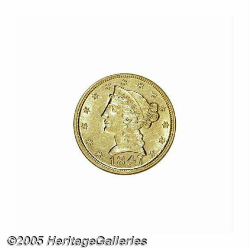 <B>1847-D<$5> MS60 NGC.</B></I> Variety 17-I, from a reverse die first used in 1845. The obverse is most easily identified by traces of recutting to the left of the bases of 1 and 4. Contrary to Winter's description, the top right corner of the digit 7 lightly touches the neck truncation. The reverse is cracked from the border, diagonally through the F, to the tops of IVE D, the pellet, and to the rim over the final A. This is a sharply struck and highly lustrous example with frosty yellow-gold surfaces. Myriad abrasions are present on both sides, but there are no singularly distracting marks. A reverse rim bruise is visible over ME. Attractive and highly desirable. Only about a dozen examples of this date survive in Mint State grades.